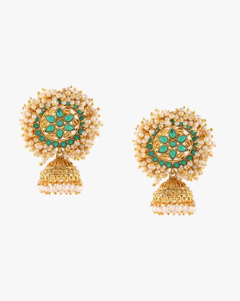 - Gold-toned dome shaped jhumkas, has artificial beads Secured with a post and back.