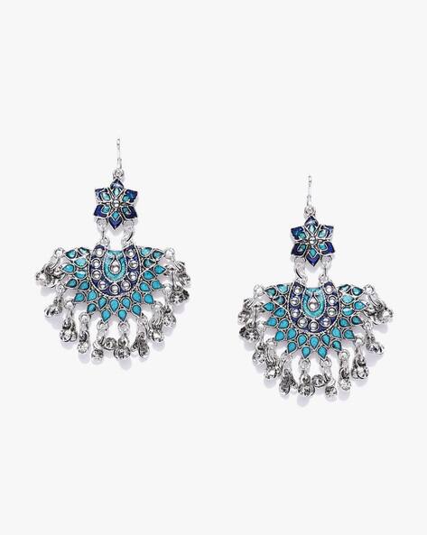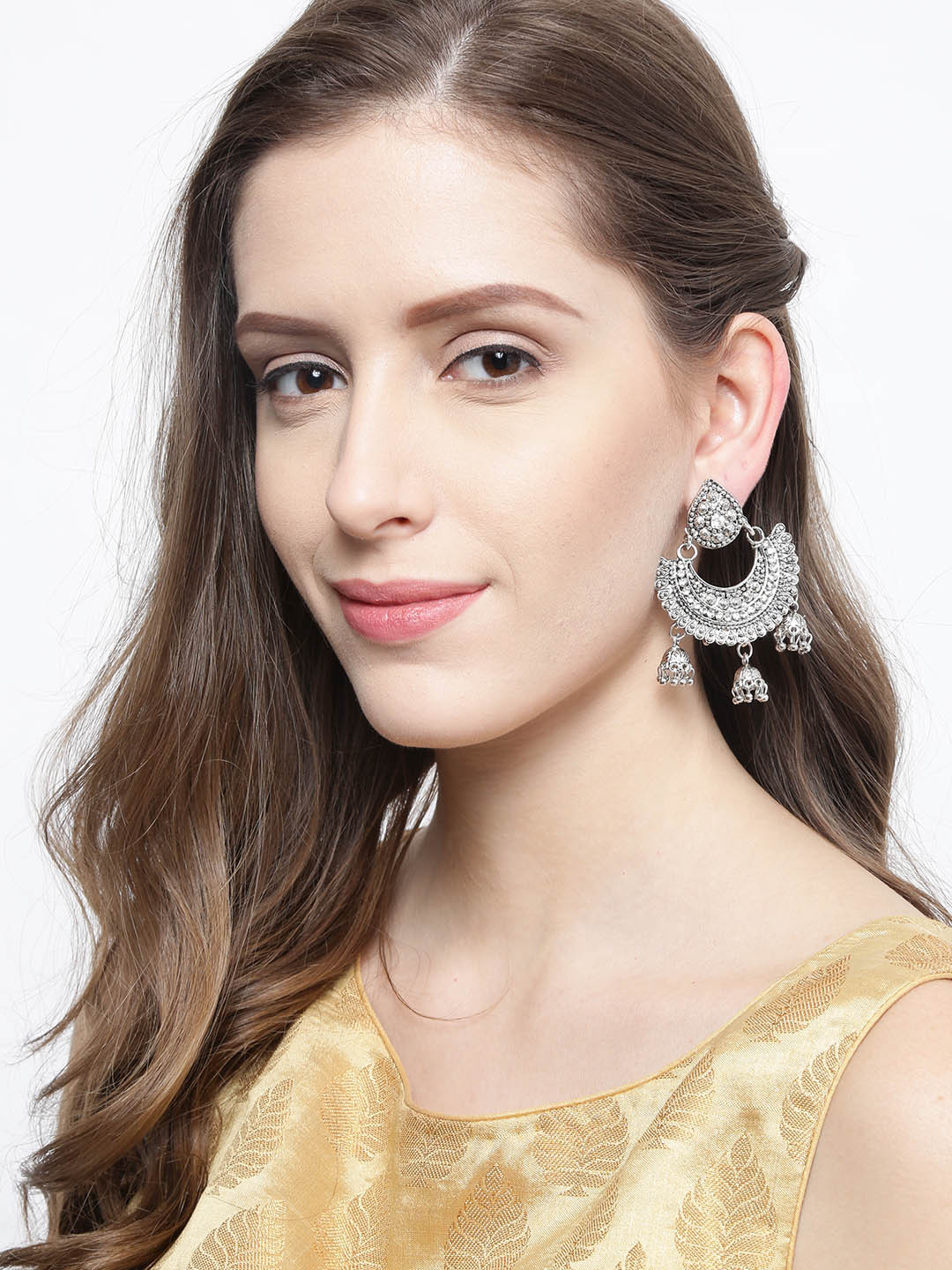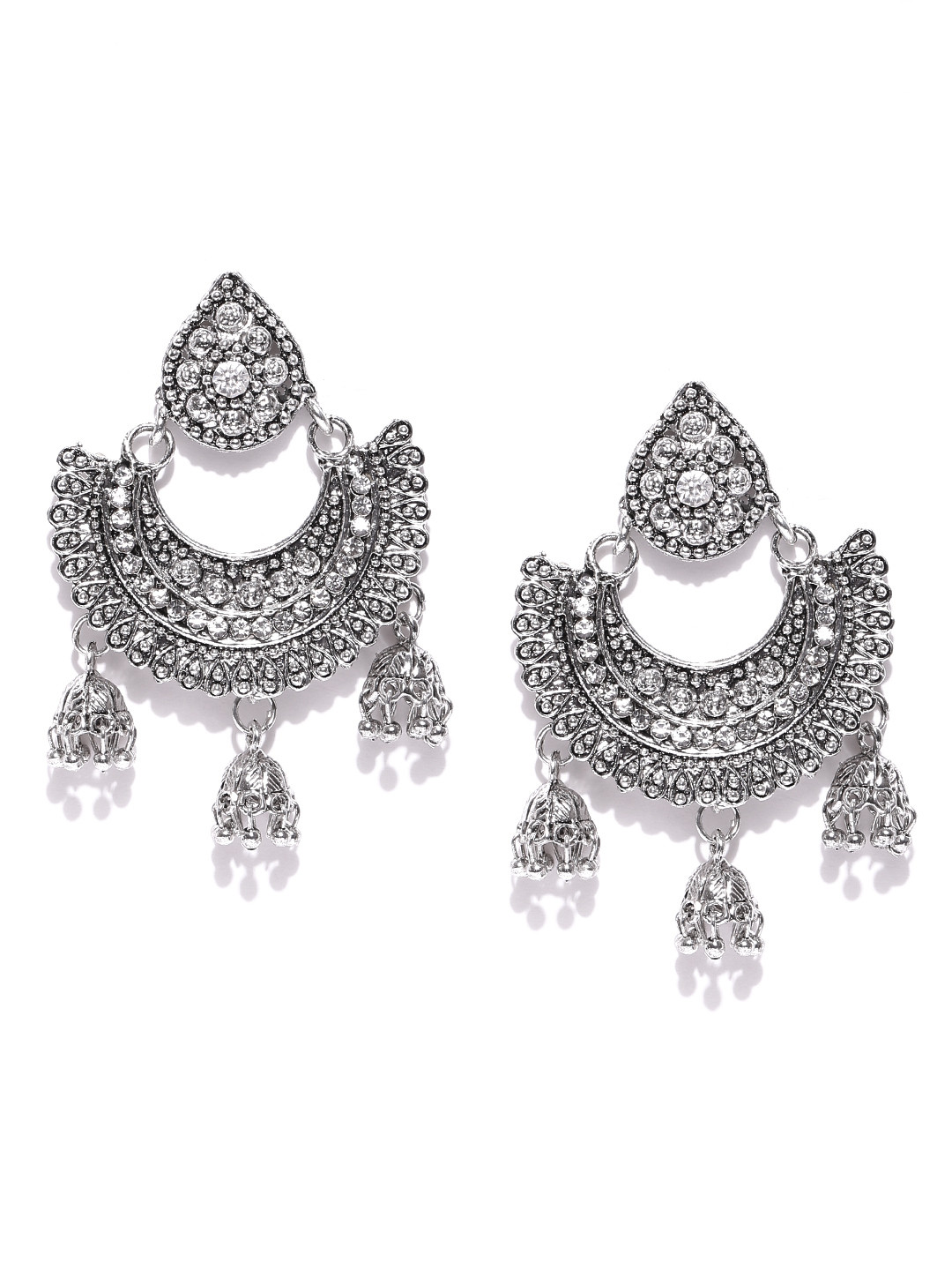 - Oxidised silver-toned crescent shaped chandbalis, silver-plated, has artificial stonesSecured with a post and back closure.