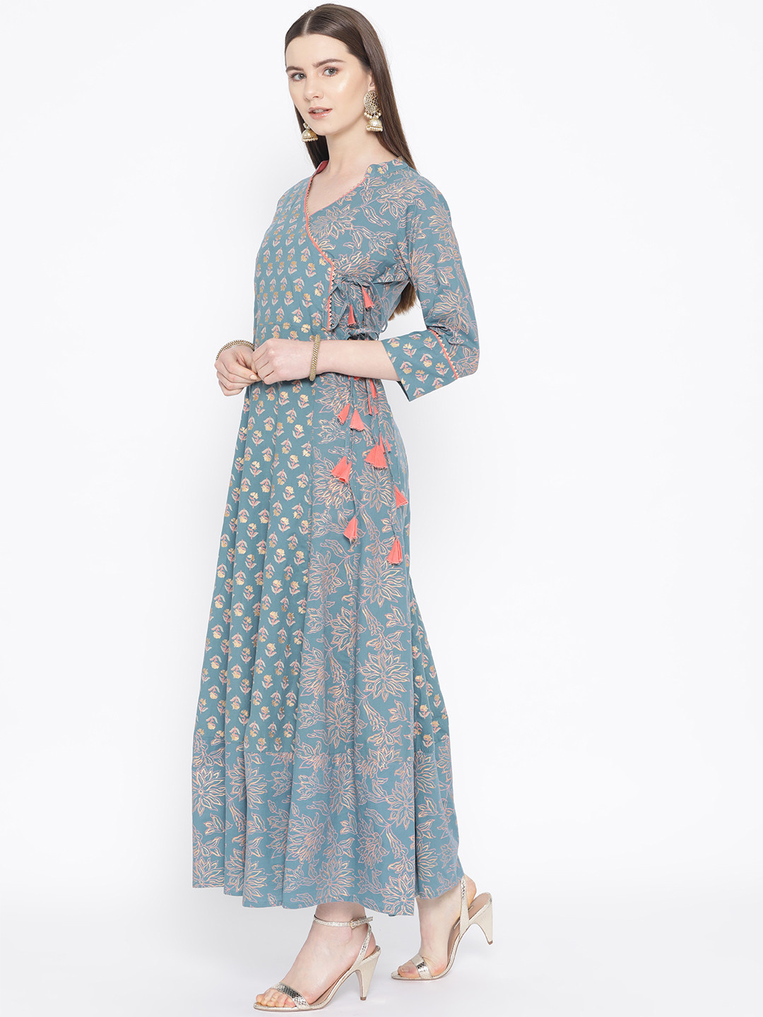 - Blue, pink and golden printed woven angrakha maxi dress with panelledtie-ups and gotta patti detail