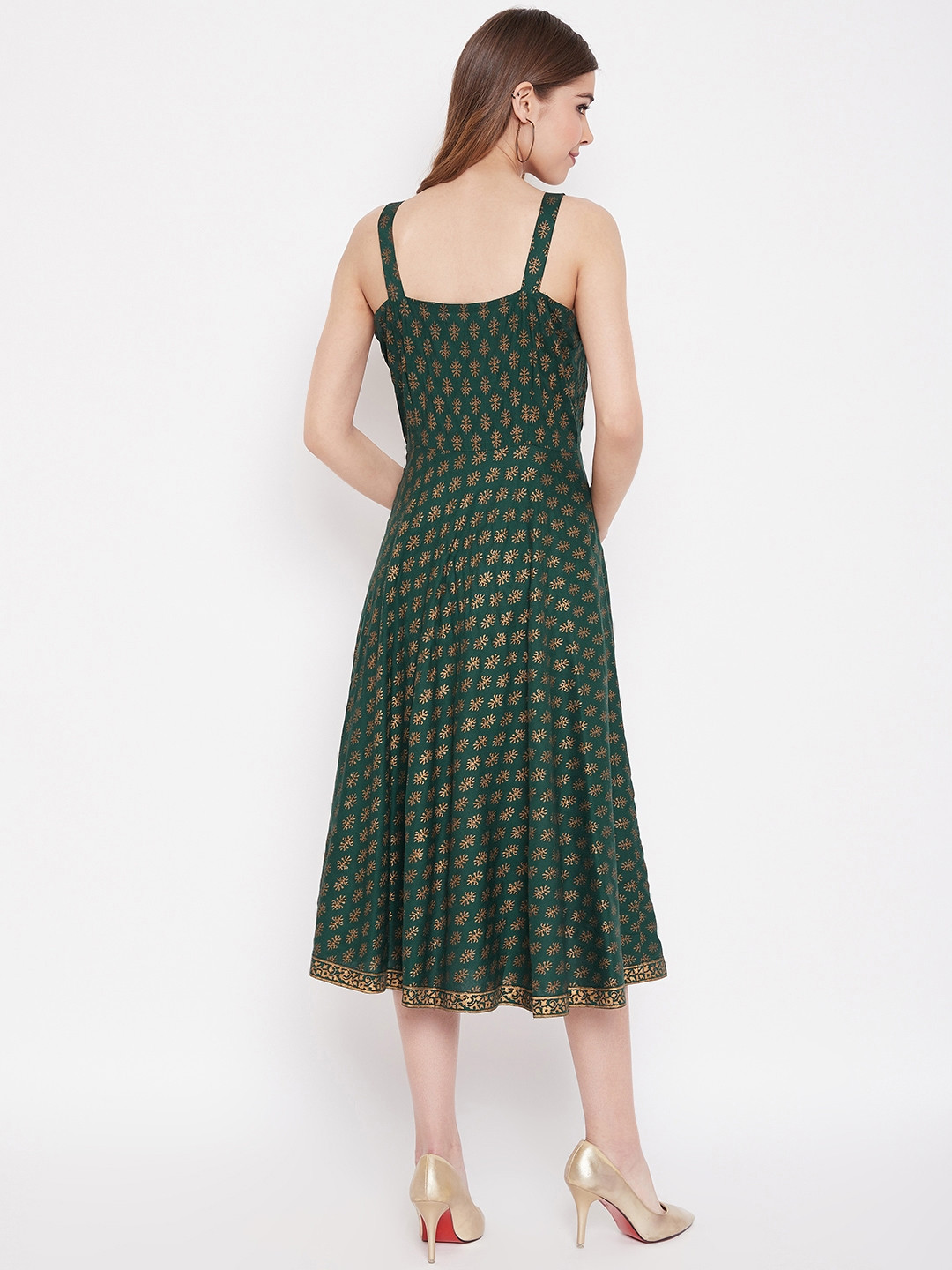 - Green and Golden hand block print woven fit and flare dress, has shoulder straps, sleeveless, concealed zip closure, and flared hem