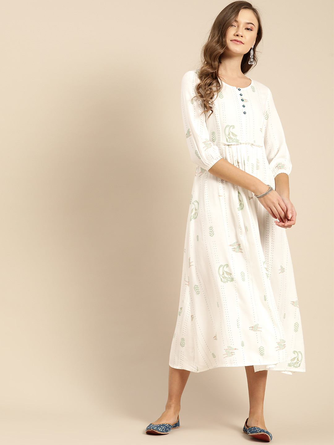 - White and Green printed woven A-line dress with gathers, has a round neck, three-quarter sleeves, button closure, and flared hem