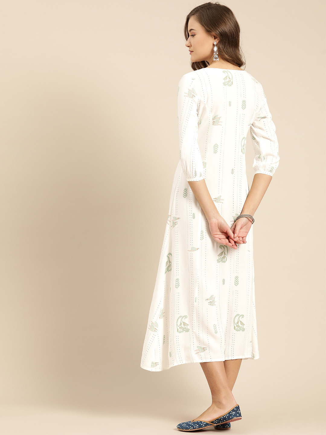 10) IMARA Women White & Green Birds Printed A-Line Dress Rs. 1259