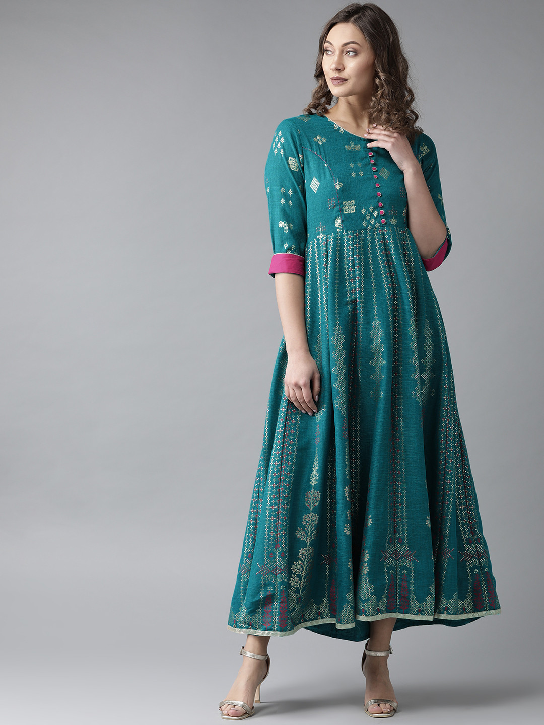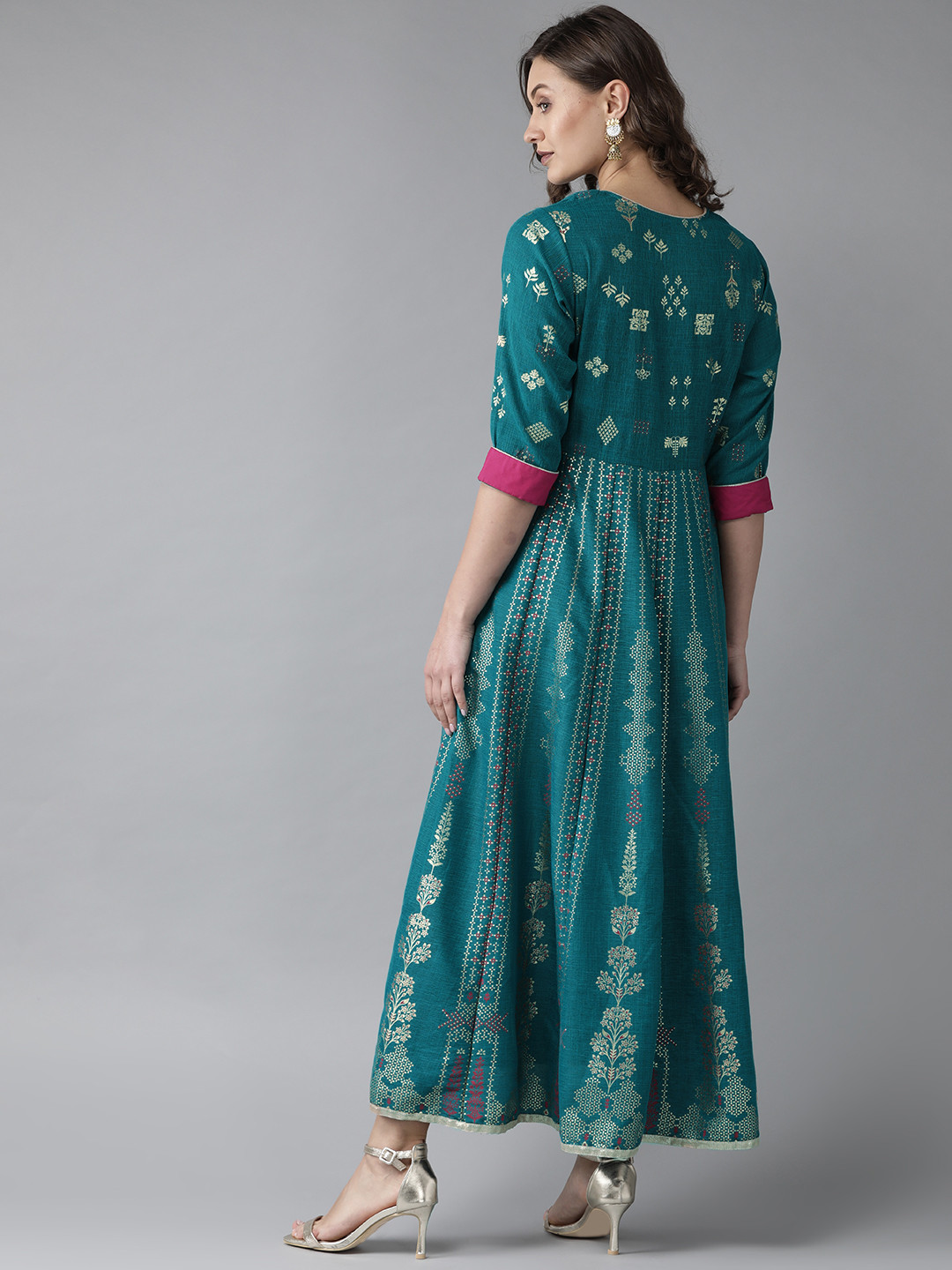 - Tealgreen and golden printed woven maxi dress, has a round neck, three-quarter sleeves, and flared hem