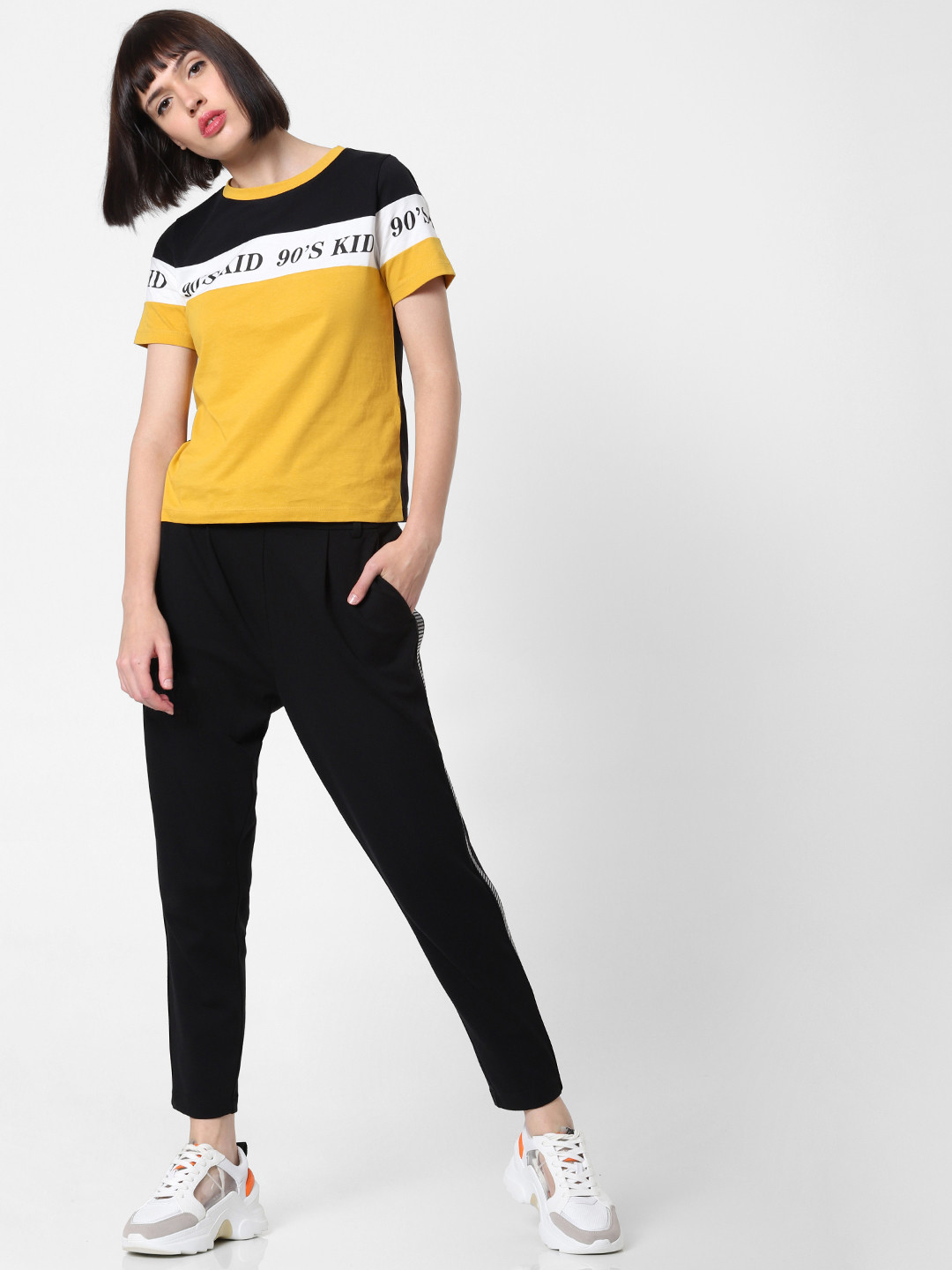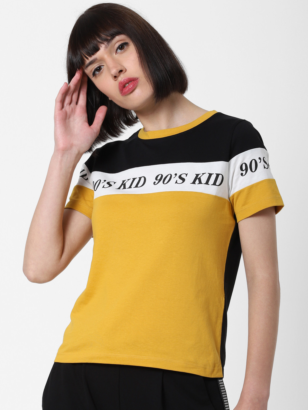 - Mustard Yellow and Black colourblocked T-shirt, has a round neck, and short sleeves.