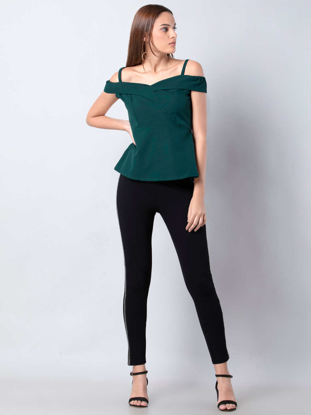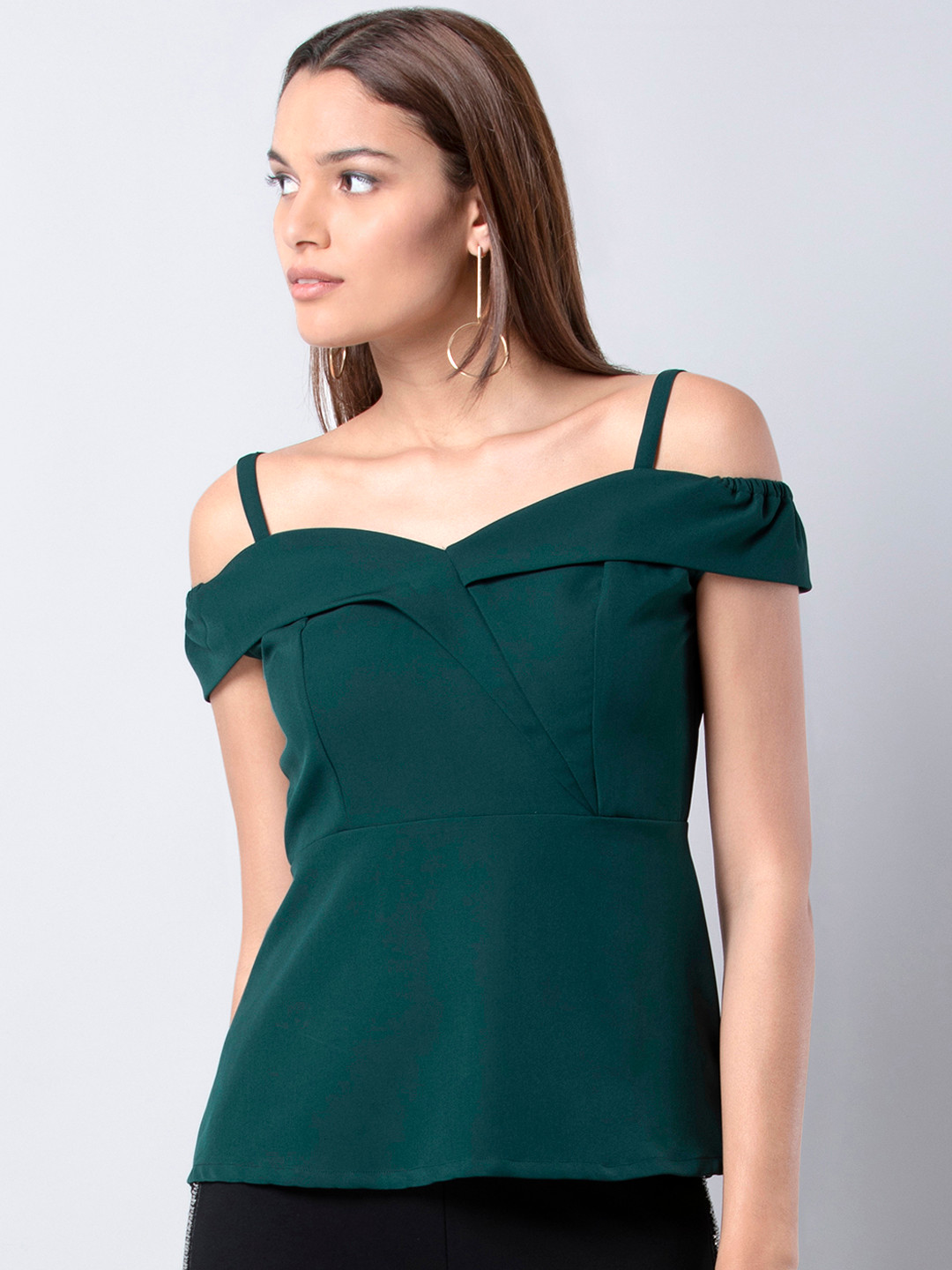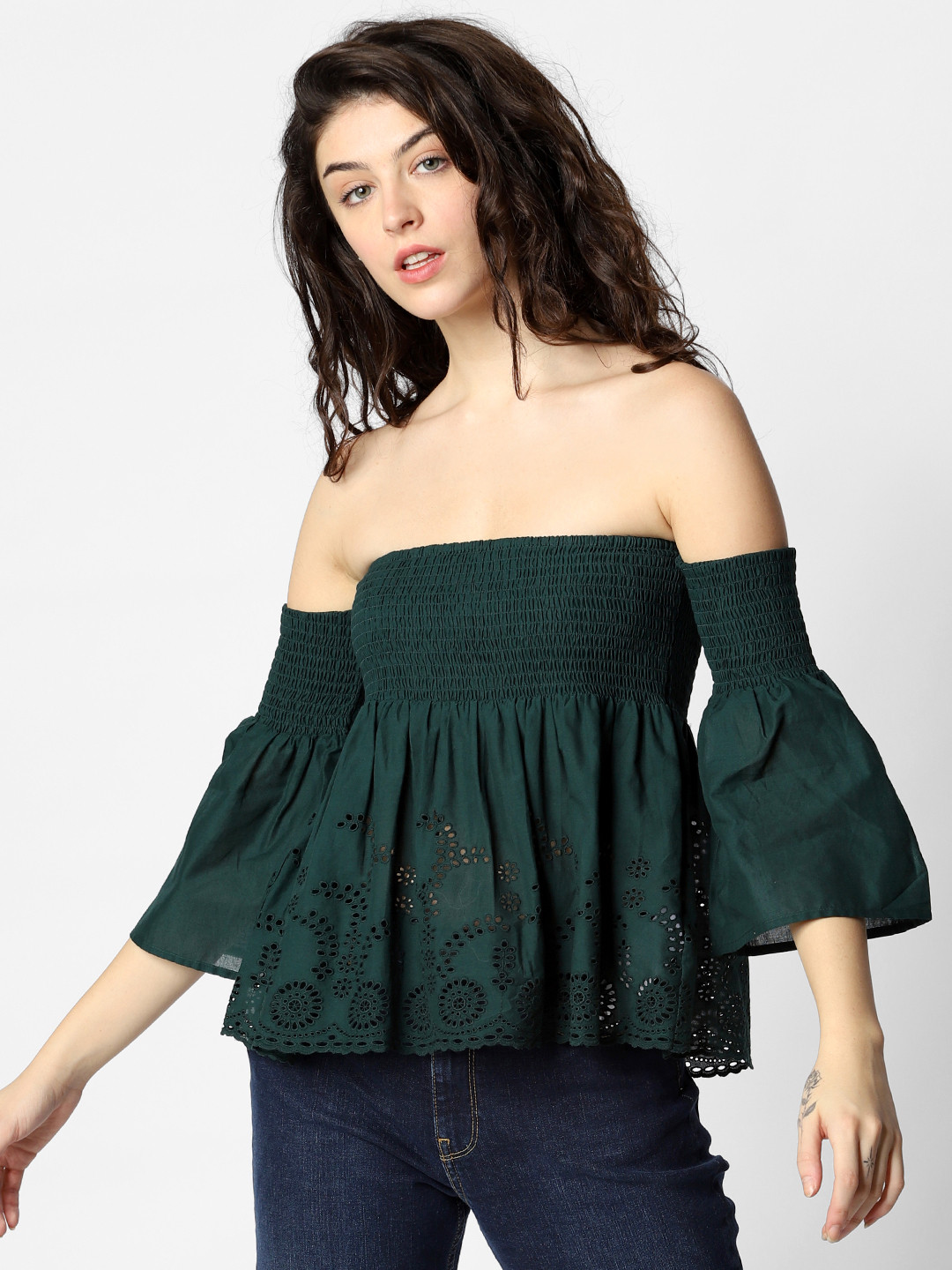 - Green solid woven bardot top, has an off-shoulder neck, smocking and cut-out detail and three-quarter sleeves