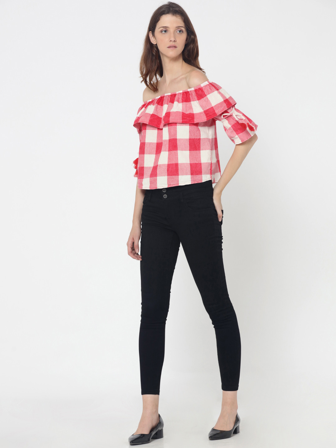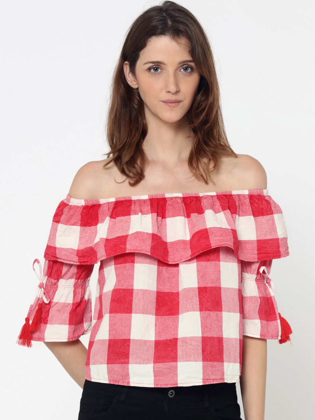 - White and coral red checked woven bardot top, has an off-shoulder neck, three-quarter sleeves.