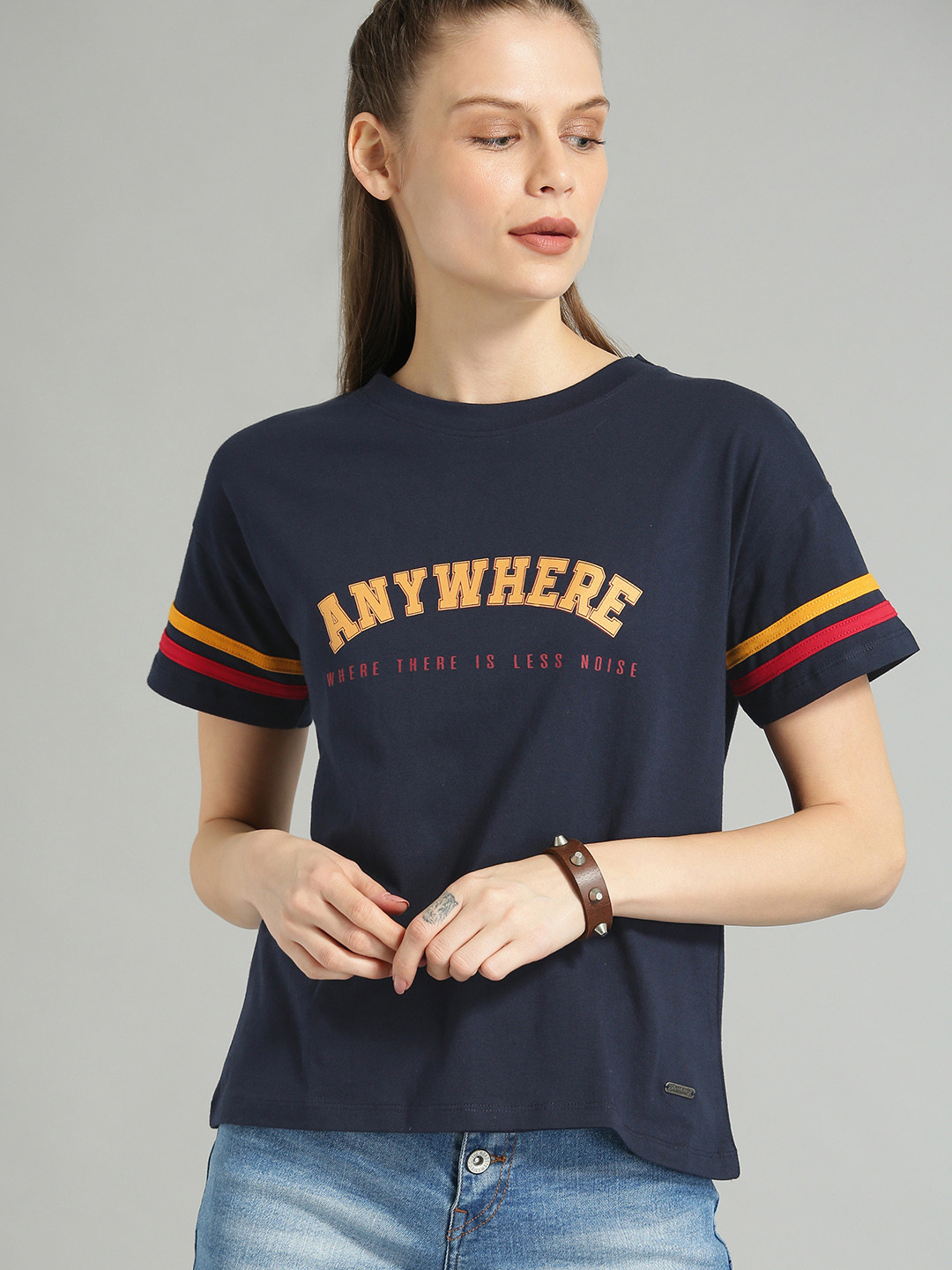 - Navy Blue printed T-shirt, has a round neck, and short sleeves.