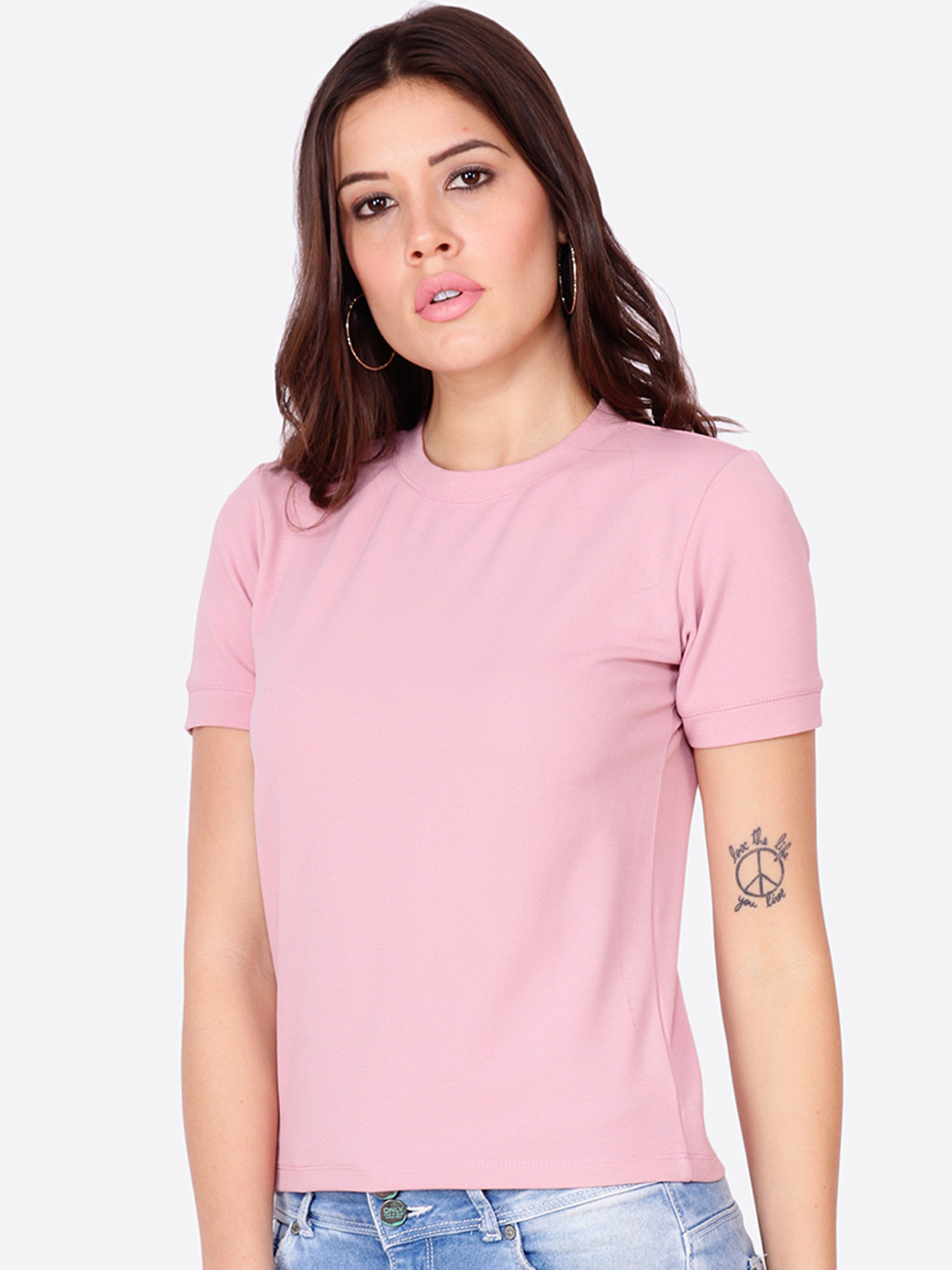 - Pink solid knitted regular top, has a round neck, short sleeves.