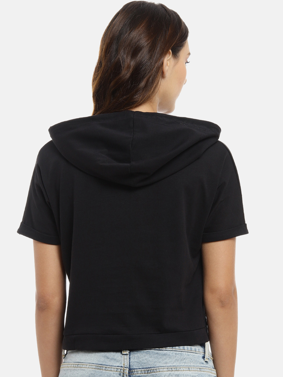 - Black solid woven boxy top, has a hooded neck, and short sleeves